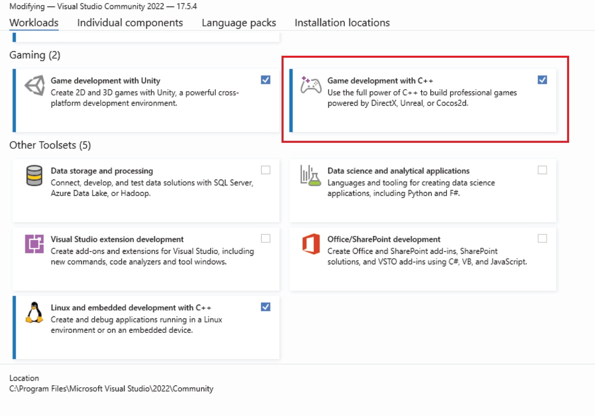 During installation, from the Workloads tab make sure to select 'Game Development with C++'