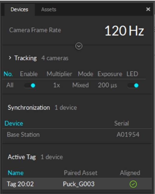 When connected to the OptiTrack system, the properties for the Active puck and its associated Base Station are shown in the Devices Pane. Please see the Devices Pane page for more details.