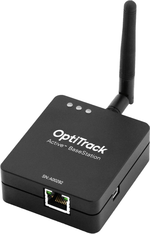 The BaseStation is the active hardware component that links other active components to Motive. Using a radio frequency channel (RF channel) between 11-26, the BaseStation synchronizes OptiTrack cameras with Active Tags and Pucks. Once the BaseStation receives the signal from the active component, it sends that data to the Motive computer along the camera network. This allows Motive to recognize Active Pucks and Tags even with significant occlusion of the LED markers, as compared to passive markers.
