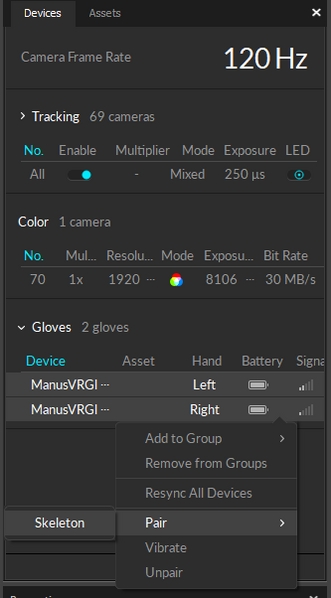 After a Skeleton has been defined, pair the Skeleton to the glove device. Open the Devices pane, right-click on the listed glove device, and pair it to the Skeleton as shown in the screenshot below.