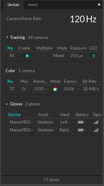 Launch Motive. If the Manus VR is properly set up on the computer, connected gloves will be listed under the Devices pane.