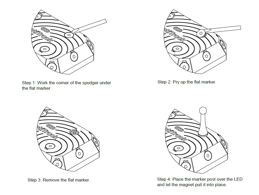 Once the flat marker is removed, place the marker post you wish to attach over the LED until you feel the magnet snap it into place.