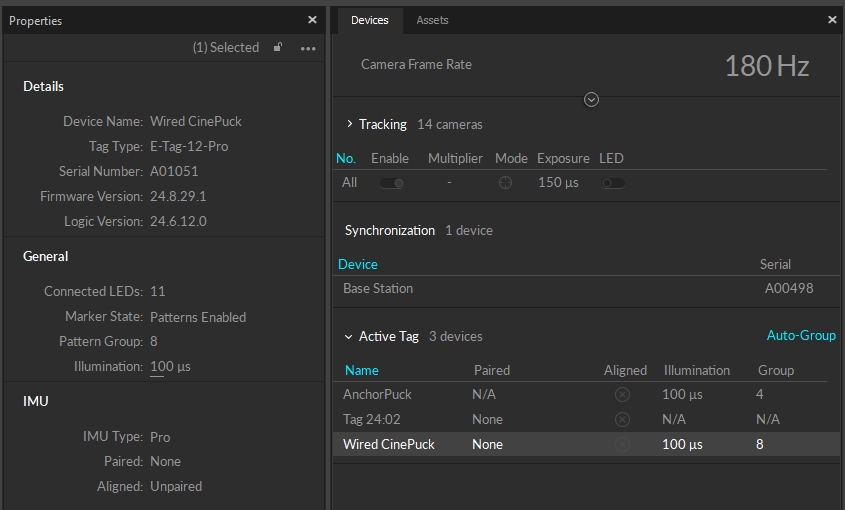 To use a Wired CinePuck in Motive, it must first be an asset. Please see the Builder pane page for instructions on creating a rigid body asset, and the IMU Sensor Fusion page for detailed instructions on pairing the IMU.