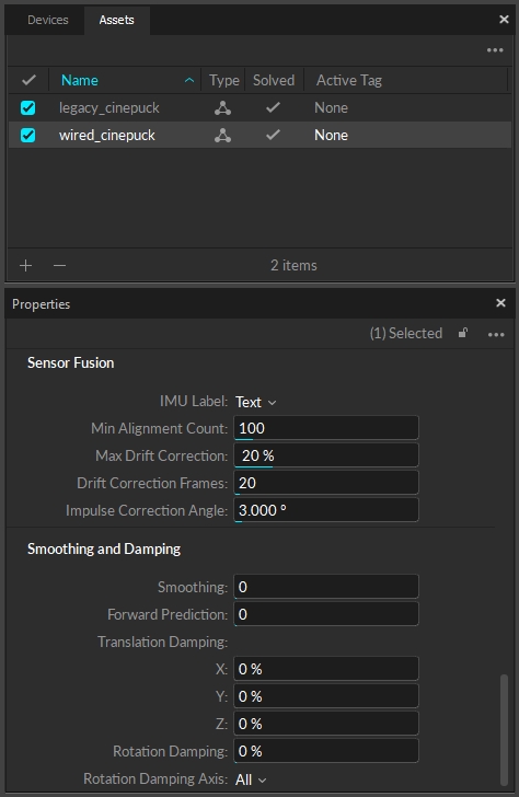 Once the Wired CinePuck rigid body is created, it will be available in the Assets pane, where you can also select it to view the IMU-related properties in the Sensor Fusion section of the Properties pane.