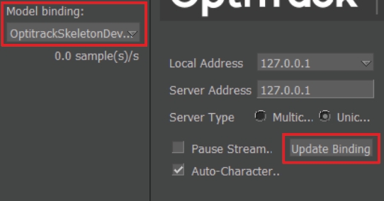 On the OptiTrack Skeleton pane, set the IP address of the OptiTrack server (e.g. Motive).