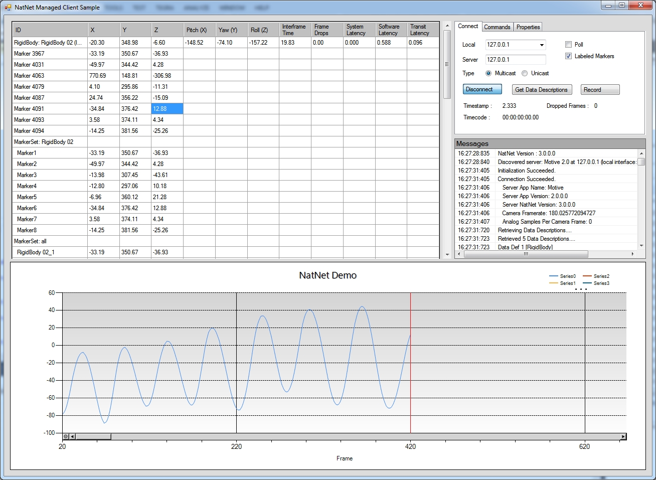 Simple C# .NET sample showing how to use the NatNet managed assembly (NatNetML.dll). This sample also demonstrates how to send and receive the NatNet commands.