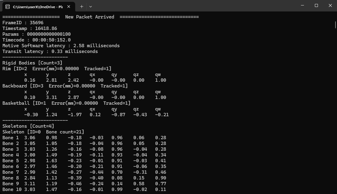 NatNet SDK/Samples/binfolder.Data will begin streaming once the connection is established, beginning with a list all the data descriptions in the Take, followed by individual frames of MoCap data.