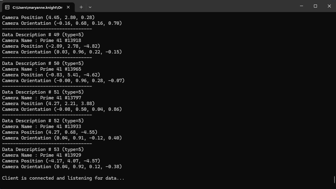 If the Take is paused in Motive, the MinimalClient will remain in a listening state, waiting for Motive to stream additional data. Start the MinimalClient with playback paused if you wish to verify the data descriptions being streamed.