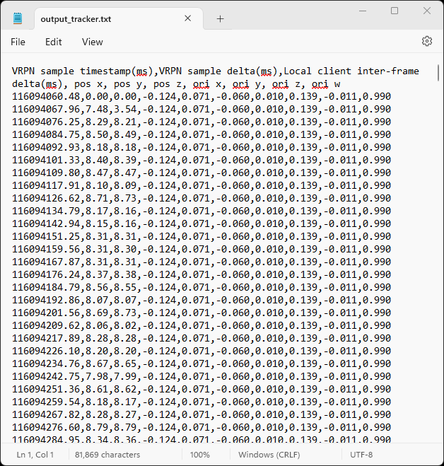 The Simple VRPN Test creates three output files in the same folder where the sample is located, overwriting any existing files with the same name: