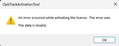 Check the license folder. If there is no license file in the folder, download it by running the License Activation Tool, available on the Motive splash page. Alternately, you can run the tool from C:\Program Files\OptiTrack\Motive\LicenseTool, or from the OptiTrack Support page.