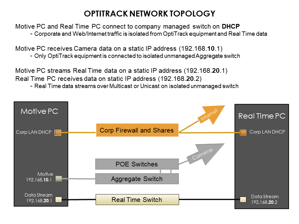 For best performance, we recommend that all OptiTrack camera systems run on an independent, isolated network.&#x20;