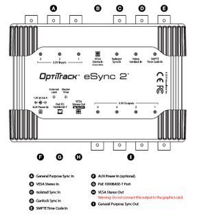 The eSync2 is a synchronization hub used to integrate external devices to an Ethernet-based mocap system. The eSync2 properties set the timecode, input trigger, and other settings to ensure all devices on the camera network are in sync.