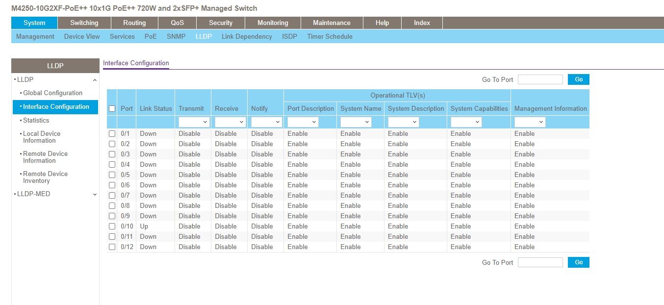 From the Navigation bar, select LLDP -> Interface Configuration.