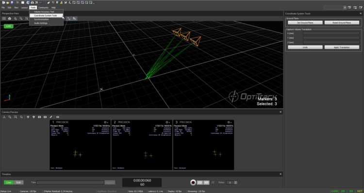 The OptiTrack Duo/Trio tracking bars are factory calibrated and there is no need to calibrate the cameras to use the system. By default, the tracking volume is set at the center origin of the cameras and the axis are oriented so that Z-axis is forward, Y-axis is up, X-axis is left.