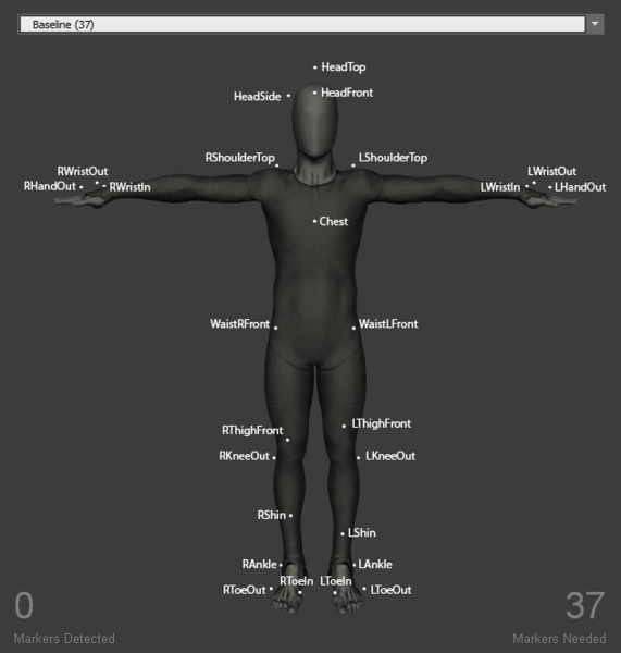 There are two different Skeleton marker templates that can be used for entertainment applications: Baseline and Core. Both of these Marker Sets provide high-quality tracking, but the Core marker set templates may provide more stable tracking for high-camera count systems.
