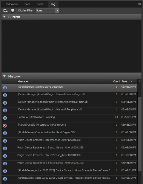 Important information regarding the status of the gloves as they integrate into Motive can be found in the Log pane.