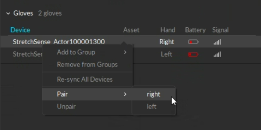 From the Devices pane select the Right glove and pair it to the right Skeleton.