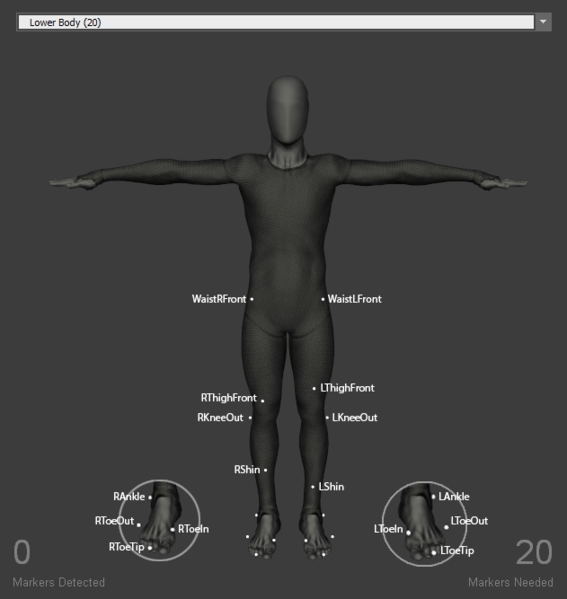 Hinged toe Marker Sets create toe segments in the Skeleton. Two additional markers are added to each foot, one on the toe-tip and another on the heel. The hinged toe markers are included in all baseline Marker Sets except for Baseline (37) and Upper Body Marker Sets.