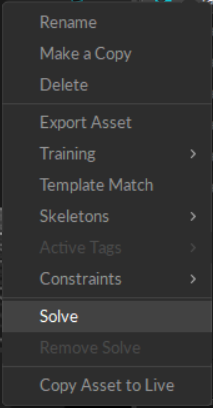Prior to exporting, the recorded skeleton must be solved. Right click on the skeleton in the Asset Pane and select Solve. Your skeleton is now ready to export.