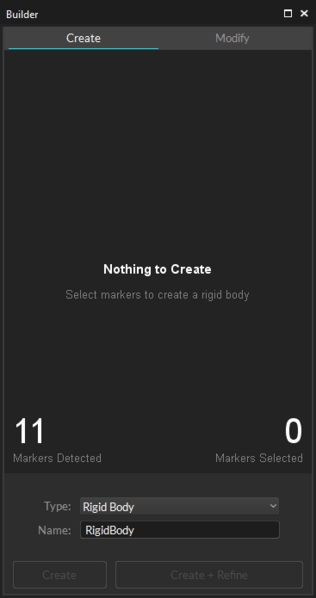 In the Builder pane, the Create and Create + Refine buttons become active once the number of Markers Needed and Markers Detected match, If Skeleton markers are not automatically detected, manually select them from the 3D perspective view.