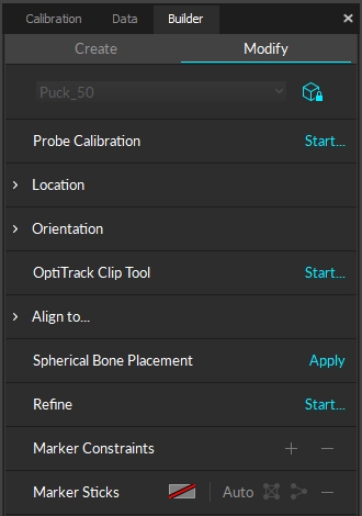 The Builder pane has tools to modify the tracking of a Rigid Body selected in Motive. To do so, select a single Rigid Body from the Viewport or Assets pane and click the Modify tab to display the options for editing a Rigid Body.