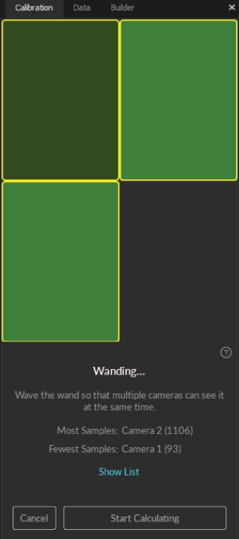 Continue wanding until the camera squares in the Calibration pane turn from dark green (insufficient number of samples) to light green (sufficient number of samples). Once all the squares have turned light green the Start Calculating button will become active.