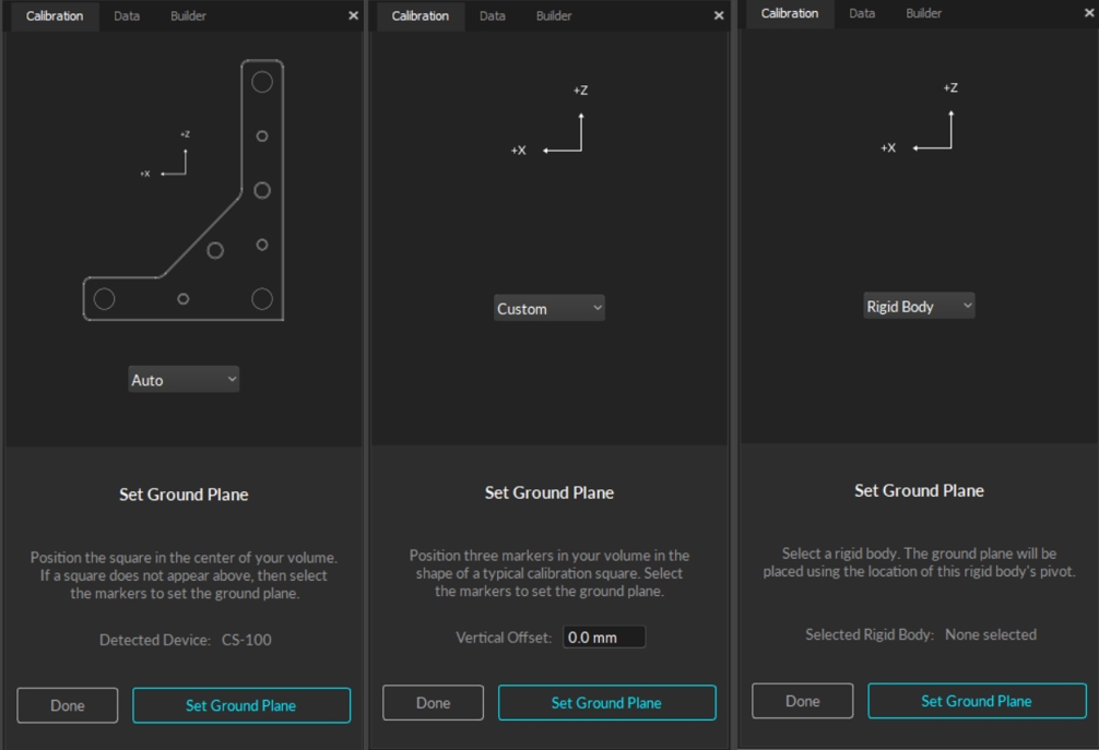 Custom: Create your own custom ground plane by positioning three markers that form a right-angle with one arm longer than the other, like the shape of the calibration square. Measure the distance from the midpoint of the marker to the ground and enter that value in the vertical offset field.