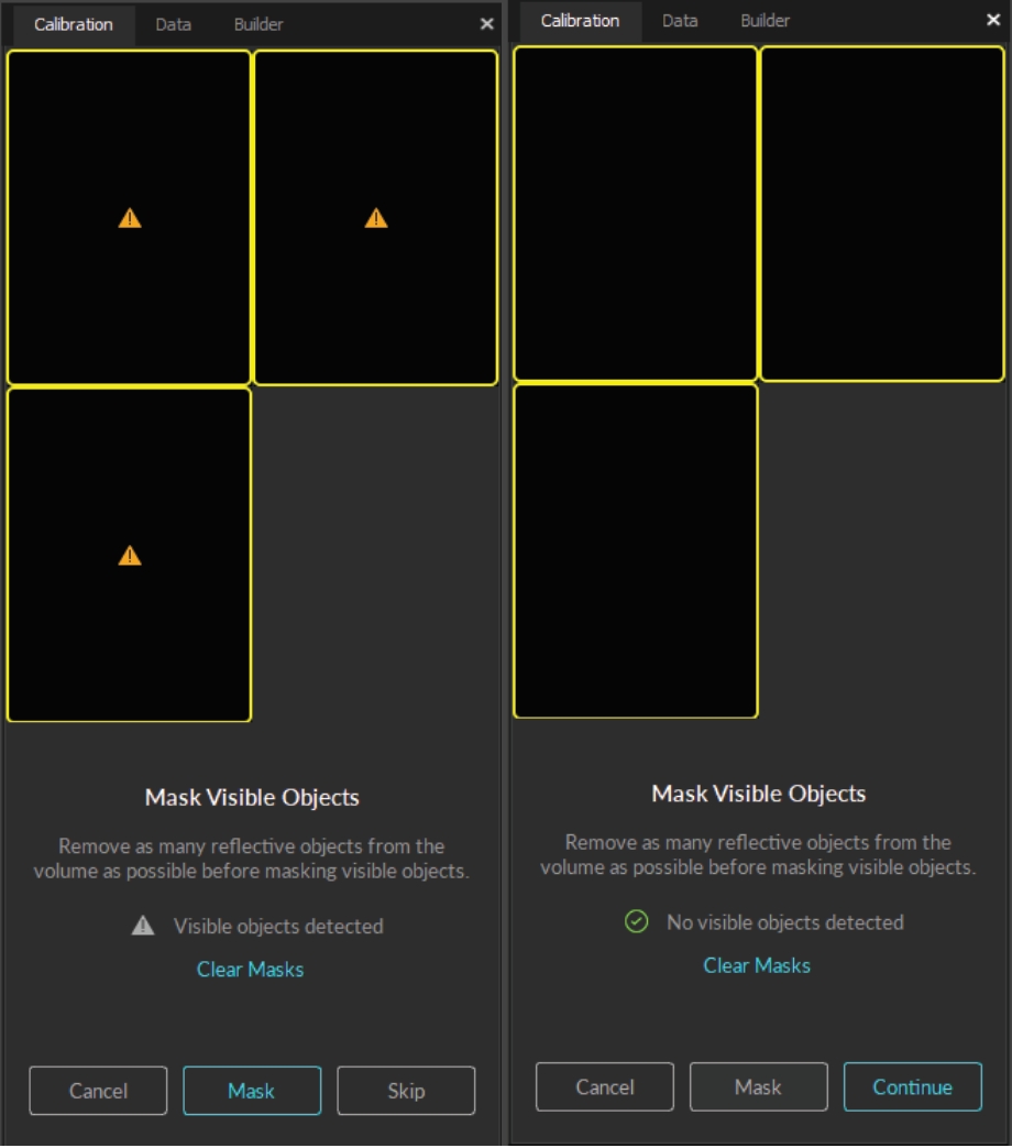 The first step in the system calibration process is to mask any reflections that cannot be removed from the volume or covered during calibration, such as the light from another camera.