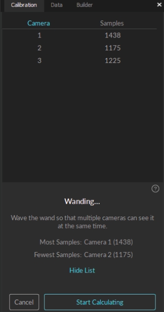 The Start Calculating button stops the collection of samples and begins calculating the calibration based on the samples taken during the wanding stage.