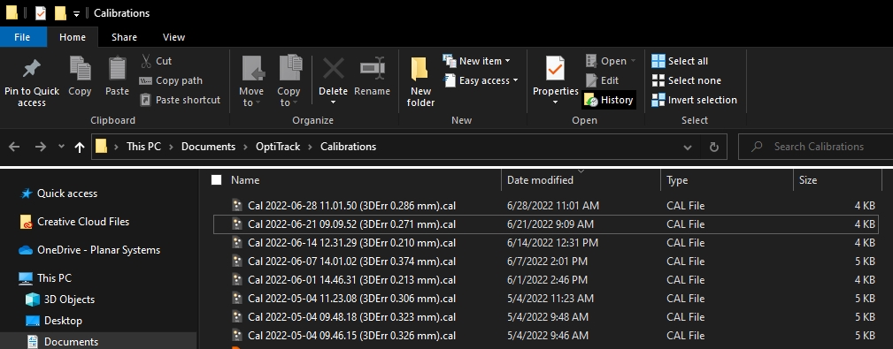Calibration files are automatically saved in the default Calibrations folder every time a calibration is completed. Click Open Calibration Folder to manage calibration files using Windows File Explorer. Calibration files cannot be opened or loaded into Motive from this window.
