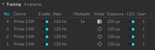The Tracking cameras category includes all the motion capture cameras connected to the system, even those running in reference video mode (MJPEG).