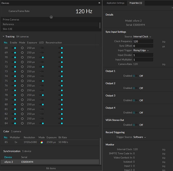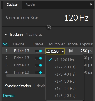 The master Camera Frame Rate is shown at the top of the pane. This is the frame rate for all the tracking cameras. Other synchronized devices, such as reference cameras, can be set to run at a fraction or a multiple of this rate.