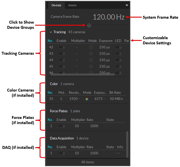 The Devices Pane lists all of the devices connected to the OptiTrack system and displays related properties that can be viewed and updated directly from the pane. Items are grouped by type: