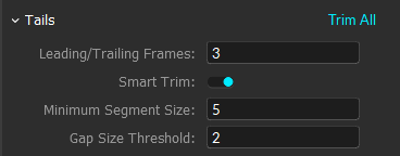 Default: 3 frames. The Trim Size Leading/Trailing defines how many data points will be deleted before and after a gap.