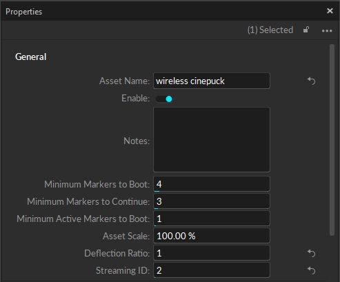 Enable or Disable tracking of the selected Rigid Body. A disabled Rigid Body will not be tracked, and its data will not be included in the exported or streamed tracking data or displayed in the 3D Viewport.