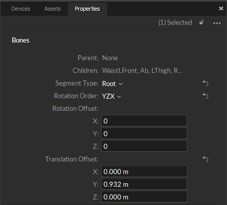 When the selected bone is directly attached to the hip (root bone), this field will display the name of the Asset.