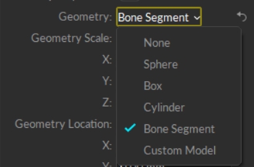 Skeleton assets use the Bone Segment geometry, which is selected by default. To use your own geometric model, select Custom Model. This will open the Attached Geometry field.
