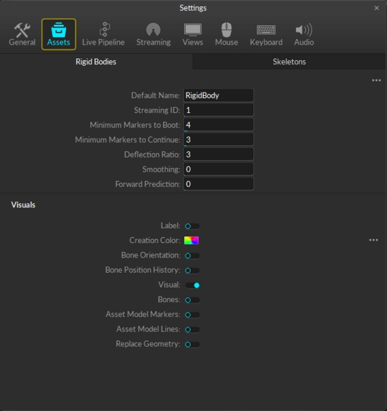 The Assets tab in the application settings panel is where you can configure the creation properties for Rigid Body and Skeleton assets. In other words, all of the settings configured in this tab will be assigned to the Rigid Body and Skeleton that are newly created in Motive.
