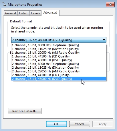 A device's audio format can be configured under the Sound settings found in the Control Panel. To do this select the recording device, click on Properties, then the default format can be changed under the Advanced Tab as shown in the image below.