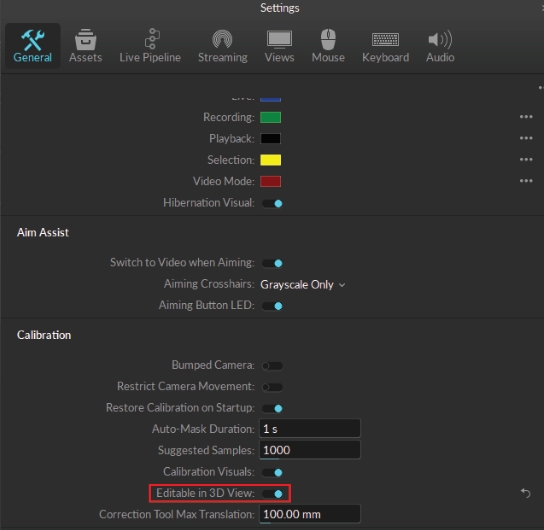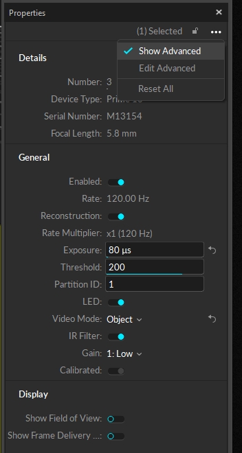 In the event that you need to manually adjust cameras in the 3D view, you can enable Editable in 3D View in General Settings. To access this setting, you'll need to select Show Advanced from the 3-dot more options dropdown at the top. This will populate a Calibration section on this window.