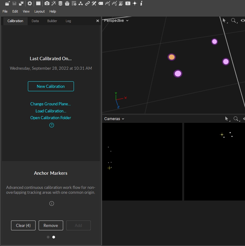 Majority of Cameras Must See Markers. A majority of cameras in a volume needs to receive some tracking data within a portion of their field of view in order to initiate the calibration process. Because of this, traditional perimeter camera systems typically work the best. Each camera should additionally see at least 4 markers for optimal calibration. If not all the cameras see the markers at the same time, anchor markers will need to be set up to improve the calibration updates.