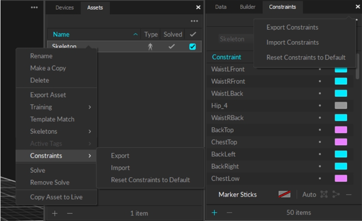When an asset definition is exported to a MOTIVE user profile, it stores marker arrangements calibrated in each asset, and they can be imported into different takes without creating a new one in Motive. Note that these files specifically store the spatial relationship of each marker, and therefore, only the identical marker arrangements will be recognized and defined with the imported asset.