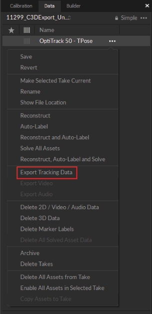 Once captures have been recorded into Take files and the corresponding 3D data have been reconstructed, tracking data can be exported from Motive in various file formats.