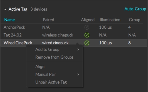 Tags recognized by Motive are listed in the Devices pane under the Active Tag section. Please see the section above for context menu options for this pane.