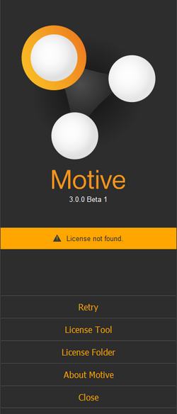 Launch Motive. If the license has been activated, the splash screen will appear momentarily before Motive loads. If not, the splash screen will display the License not found error and a menu.