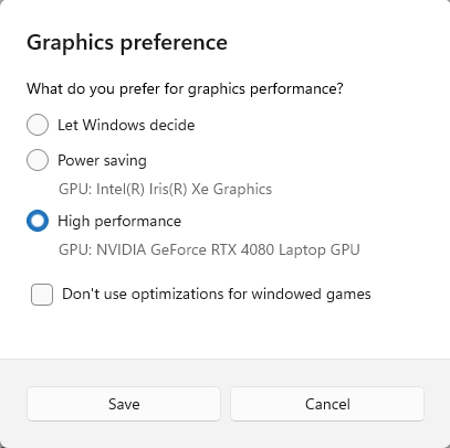 Type Graphics in the Windows Search bar to find and open the Graphics settings, located at System > Display > Graphics.