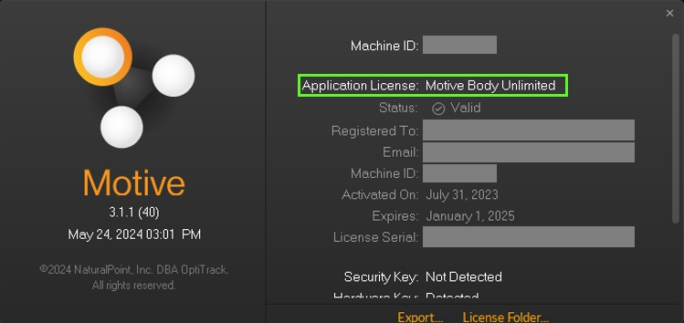 If Motive does not detect an active license, you can still open About Motive from the splash screen, however the only information available is the Machine ID.