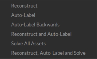 Reconstruct, Auto-Label and Solve: Creates a new 3D data set, auto-labels and solves all assets in the Take. When an asset is solved, Motive stores the tracking data for the asset in the Take then reads from that Solved data to recreate and track the asset in the scene.