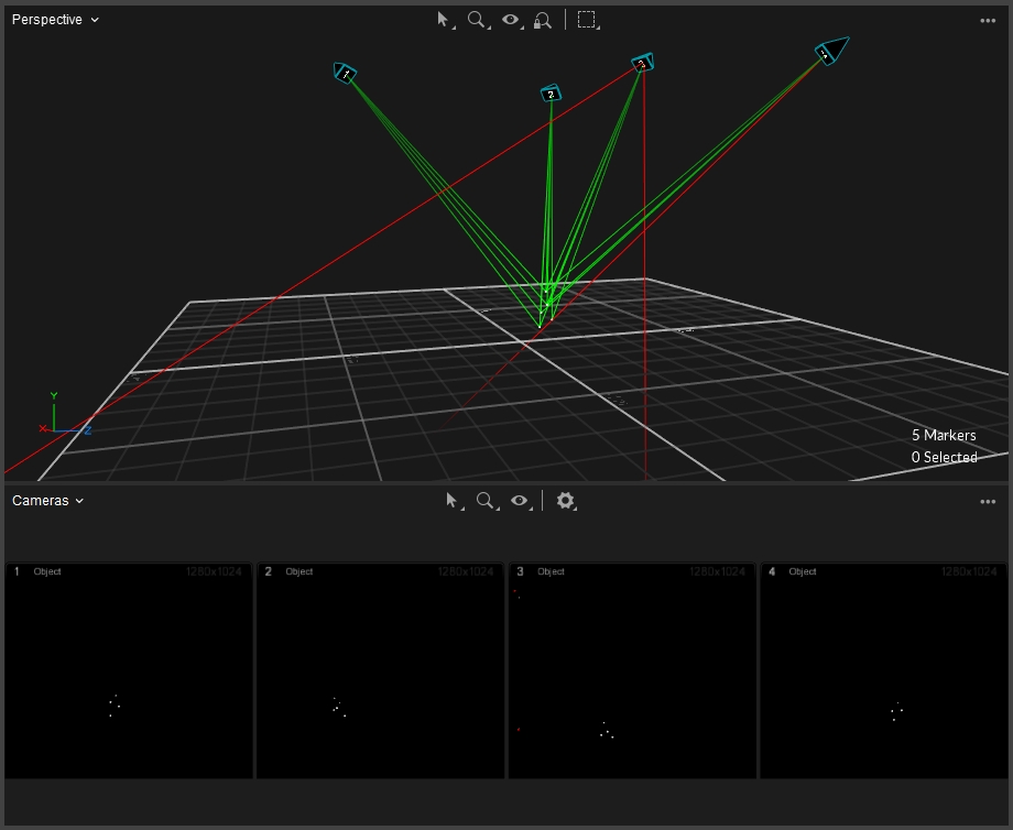 When Motive is processing in real-time, you can examine the marker rays and other visuals from the viewport, review and modify the Live-Pipeline settings, and otherwise optimize the 3D data acquisition.