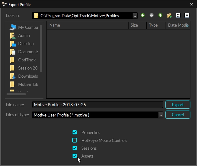 Assets can be exported into the Motive user profile (.MOTIVE file) if they need to be re-imported. The user profile is a text-readable file that contains various configuration settings in Motive, including the asset definitions.